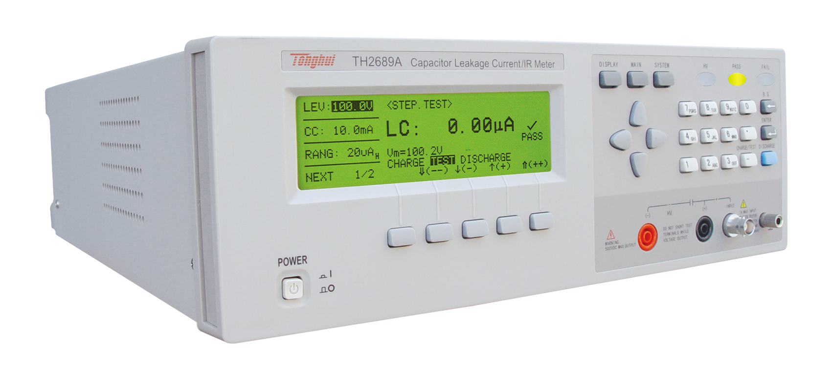 ■?TH2689A型電容器漏電流/絕緣電阻測試儀分別提供最大測試電壓:500V,充電電流0.5mA~500mA(>100V時由最大輸出功率50W限制)。主要應用于電解電容/陶瓷電容等漏電流,絕緣電阻及鋁電解電容陽極箔耐壓測試。也可應用突波吸收器,齊納二極管,氖燈管等動作電壓確認和漏電流測試。標配了RS232、Handler接口,可選購的GPIB接口,以及穩定快速的測量,使TH2689不僅可以應用于進貨檢驗,更可應用于自動化生產測試等等。